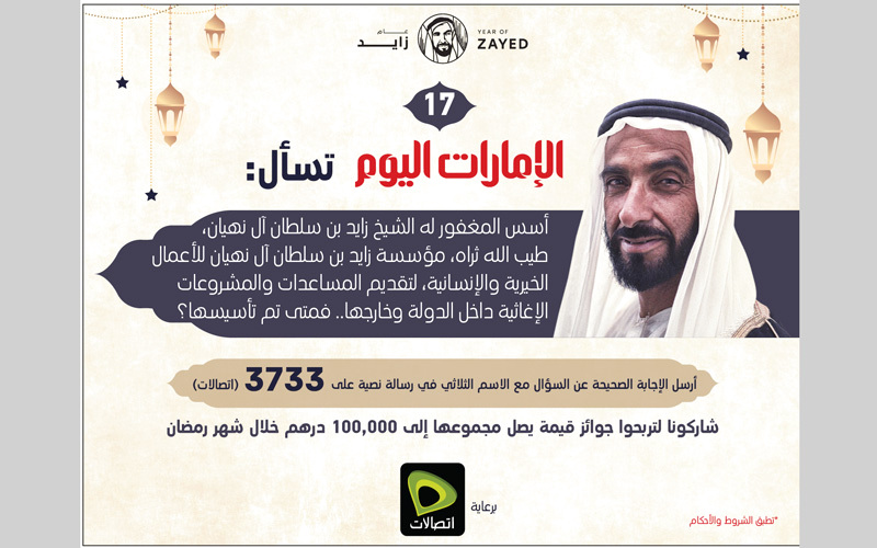 تويتر لينكدين تويتر فيسبوك مجاناً يُمكنك الاشتراك الآن بنشرتنا البريدية لتبقى على اطلاع بأبرز الأخبار والمواضيع Email address First name (إختياري) الإمارات اليوم تسأل: أسس المغفور له الشيخ زايد بن سلطان آل نهيان، طيب الله ثراه، مؤسسة زايد بن سلطان آل نهيان للأعمال الخيرية والإنسانية، لتقديم المساعدات والمشروعات الإغاثية داخل الدولة وخارجها.. فمتى تم تأسيسها؟ المصدر: دبي ـــ الإمارا ت اليوم التاريخ: 02 يونيو 2018 Share فيسبوك تويتر لينكدين Pin Interest Whats App