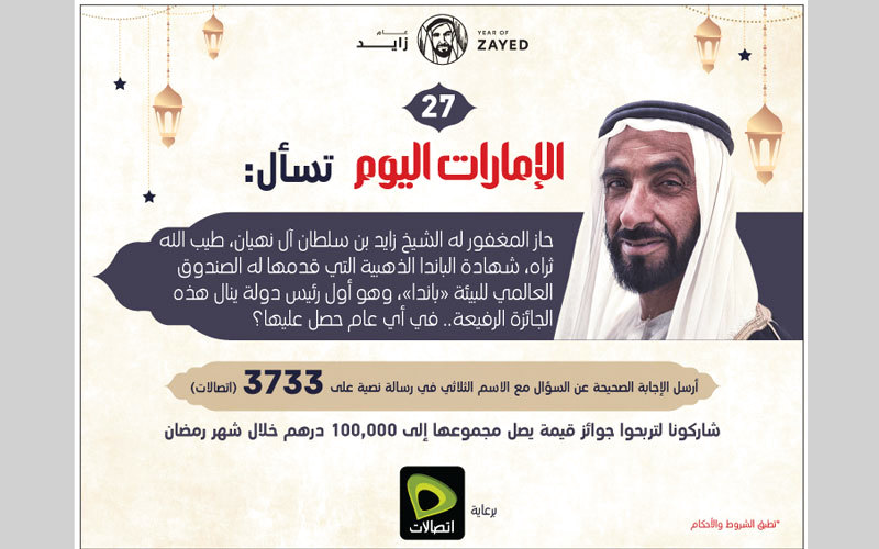 تويتر لينكدين تويتر فيسبوك مجاناً يُمكنك الاشتراك الآن بنشرتنا البريدية لتبقى على اطلاع بأبرز الأخبار والمواضيع Email address First name (إختياري) الإمارات اليوم تسأل: حاز المغفور له الشيخ زايد بن سلطان آل نهيان، طيّب الله ثراه، شهادة الباندا الذهبية التي قدمها له الصندوق العالمي للبيئة «باندا»، وهو أول رئيس دولة ينال هذه الجائزة الرفيعة.. في أي عام حصل عليها؟ المصدر: دبي ـــ الإمارا ت اليوم التاريخ: 12 يونيو 2018 Share فيسبوك تويتر لينكدين Pin Interest Whats App