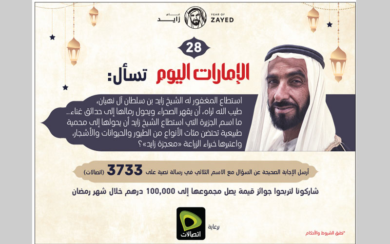 الإمارات اليوم تسأل : ما اسم الجزيرة التي استطاع المغفور له الشيخ زايد بن سلطان آل نهيان، طيب الله ثراه، أن يحولها إلى محمية طبيعية تحتضن مئات الأنواع من الطيور والحيوانات والأشجار، واعتبرها خبراء الزراعة «معجزة زايد»؟