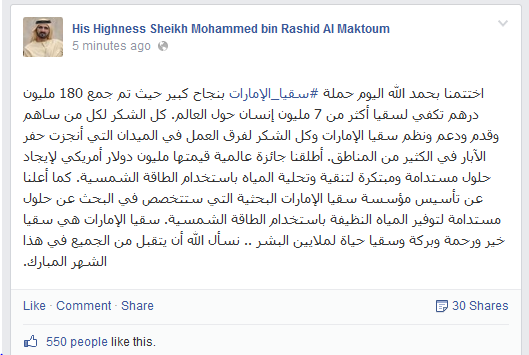 وكان سموه قد شكر في صفحته الخاصة على موقع التواصل الاجتماعي فيس بوك كل المساهمين والمشاركين في دعم حملة "سقيا الإمارات"، قائلا: "اختتمنا بحمد الله اليوم حملة "سقيا الإمارات" بنجاح كبير حيث تم جمع 180 مليون درهم تكفي لسقيا أكثر من 7 مليون إنسان حول العالم. كل الشكر لكل من ساهم وقدم ودعم ونظم سقيا الإمارات وكل الشكر لفرق العمل في الميدان التي أنجزت حفر الآبار في الكثير من المناطق".