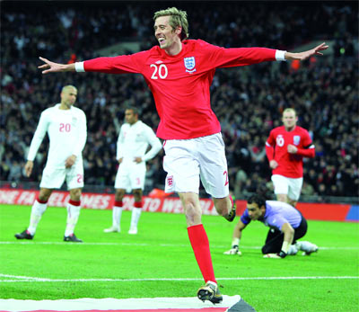 ودفع كابيللو بمايكل كاريك وبيتر كراوتش مكان لامبارد وديفو مطلع الشوط الثاني. وتلاعب روني بالدفاع المصري وسدد كرة ساقطة من حافة المنطقة بين يدي الحارس الحضري (49). وردت مصر بتسديدة زيدان بين يدي الحارس غرين اثر ركلة ركنية (50). وكان كراوتش عند حسن ظن مدربه ونجح في إدراك التعادل بعد هجمة منسقة مرر على اثرها جيرارد كرة داخل المنطقة الى باري المتوغل فهيأها الى كراوتس الذي تابعها بيمناه من مسافة قريبة على يسار الحارس الحضري (56) رافعا رصيده الى 19 هدفاً دولياً.