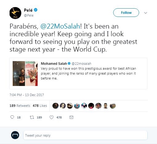 تفاجأ الجمهور المصري والعربي بتغريدة للأسطورة البرازيلية بيليه، احد افضل من أنجبت كرة القدم في التاريخ وصاحب الرقم القياسي في الحصول على كأس العالم في ثلاث بطولات، وهو يغرد على حسابه الرسمي على موقع التواصل الاجتماعي "تويتر"، عن لاعب منتخب مصر ونادي ليفربول الانجليزي تعليقا على فوزه بجائزة افضل لاعب في افريقيا والمقدمة من بي بي سي.
