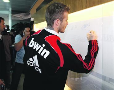 بيكهام يوقع على أحد جدران الأكاديـمية. أ.ف.ب