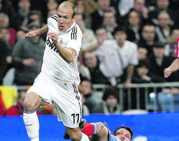لاعب ريال مدريد روبين يحاول اختراق دفاعات أتلتكو مدريد. أ.ب.أ