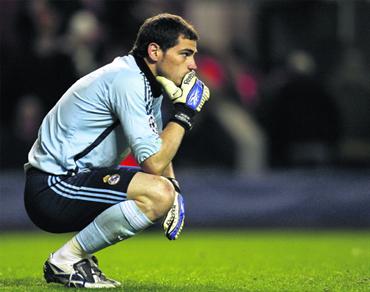 حارس الريال كاسياس لم يصدق الهزيمة بالأربعة أمام ليفربول. أ.ف.ب