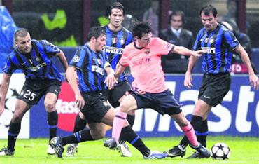 وفي المباراة الاولى، استهل برشلونة صاحب الثلاثية التاريخية الموسم الماضي «الدوري والكأس ومسابقة دوري ابطال اوروبا» حملة الدفاع عن لقبه بتعادل ثمين مع مضيفه انتر ميلان على غرار مواجهتهما السابقة والوحيدة في المسابقة على الملعب ذاته موسم 2002-.2003 والتقى برشلونة وإنتر ميلان مرة واحدة في موسم 2002-،2003 ففـاز برشلونـة ذهـاباً 3-صفر، وتعادلا سلباً إياباً. وكان برشلونة الطرف الافضل في المباراة وكان بإمكانه الخروج فائزاً بالنظر الى الفرص الحقيقية للتسجيل التي تناوب مهاجموه في اهدارها بالاضافة الى تألق حارس مرمى اصحاب الارض الدولي البرازيلي جوليو سيزار في الذود عن عرينه والحفاظ على نظافة شباكه.
