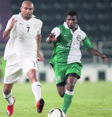 مهاجم السد ألفيس يحاول تجاوز لاعب الأهلي خالد عثمان. رويترز