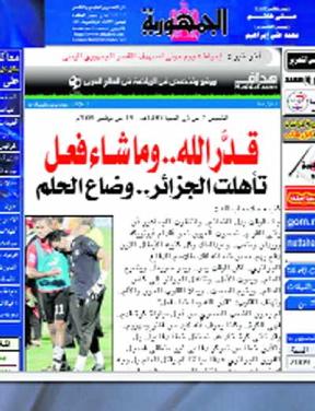 خصّصت الصحف المصرية، أمس، عناوينها الرئيسة للأحداث التي أعقبت مباراة المنتخبين المصري والجزائري في الخرطوم وأعربت عن أسفها لـ«ضياع حلم» المونديال. وكتبت الأهرام الحكومية في عنوانها الرئيس: «خروج مشرف لمنتخبنا الوطني من تصفيات المونديال». أما صحيفة «الدستور» المستقلة فكتبت: «خليكو رافعين علم مصر.. المنتخب انهزم.. مصر لا». وقالت صحيفة «الجمهورية»: «قدر الله وما شاء فعل.. تأهلت الجزائر وضاع الحلم». وخصصت معظم الصحف صفحاتها الأولى للحديث عن قيام الجمهور الجزائري بمهاجمة المشجعين المصريين في الخرطوم بعد المباراة ورشق حافلات المشجعين المصريين بالحجارة. واعتبرت الصحيفة أن الجميع انتظر صحوة «الفراعنة»، ومن بينهم المنتخب الجزائري نفسه، مضيفة «مباراة الخرطوم الفاصلة انتهت أمس بضياع الحلم المصري. كان حلماً وطار من أقدام لاعبينا، لكن الأهم أننا لم نفقد الثقة بأنفسنا ولم نفقد الثقة بنجومنا ولم نفقد الثقة بقدرات الكرة المصرية فهي مازالت الأفضل، ومازال هؤلاء اللاعبون هم أبطال إفريقيا وحاملو اللقب الإفريقي». وواصلت الجمهورية: «لم تكن مباراة الخرطوم مجرد مباراة عادية، ولم تكن مباراة واحدة، بل كانت 20 مباراة أو اكثر.. كانت مباراة في الحرب النفسية». وكتبت صحيفة «المصري اليوم» المستقلة: «اعتداءات بربرية على الجماهير المصرية في الخرطوم».