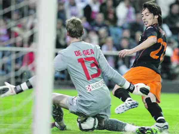 لاعب أتلتيكو مدريد ديفيد فيا يسدّد الكرة بين أقدام حارس فالنسيا. إي.بي.إيه