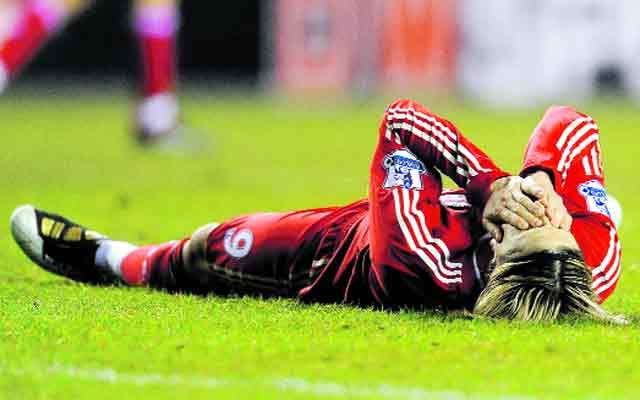 توريس يفترش الأرض حزناً على خسارة فريقه ليفربول. غيتي