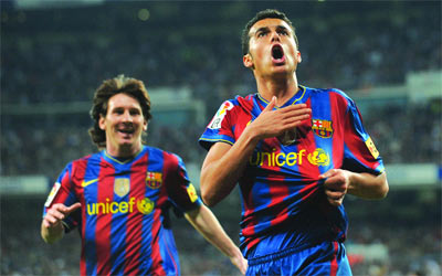 فوز صريح في افتتاح المرحلة الحادية والثلاثين من الدوري الاسباني لكرة القدم بهدفين للمعجزة ميسي والتلميذ النجيب بدرو، وضع برشلونة على قمة ترتيب الليغا، انتزعه من ملعب «سانتياغو برنابيو» الذي عاش هزة أخرى من الاستقلاليين الكاتالونيين بعد مجزرة العام الماضي 6-.2