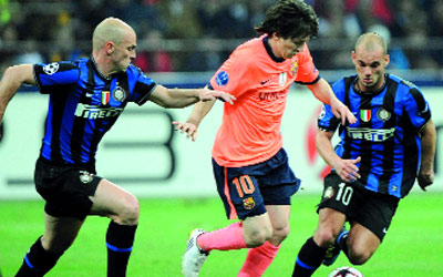 1-لاعب برشلونة ميسي محاصراً من لاعبي انتر ميلان شنايدر «يمين» وكمبياسو، حيث تمكن الفريق الايطالي من إبطال مفعول النجم البرشلوني طوال المباراة دون ان يتمكن الولد الشقي من بلوغ الشباك.