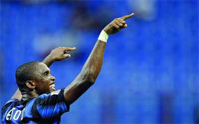 إيتو يحتفل بتسجيل هدف الفوز للإنتر على طريقة أسود الكاميرون. أ.ب