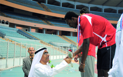 الكمالي يسلم محمد عباس ذهبية سباق الوثب الثلاثي. من المصدر