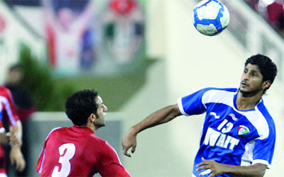 الكويتي مساعد ندا يحاول استقبال الكرة أمام اليمني محمد العماري. أ.ف.ب