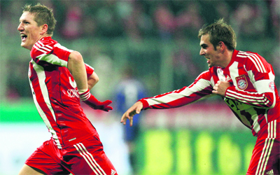 لام يحتفل مع شفاينشتايغر بالفوز على فرايبورغ. رويترز