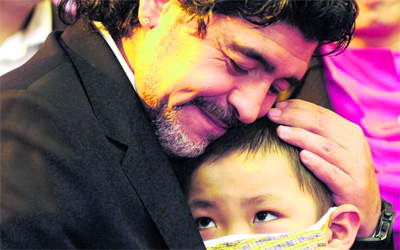 مارادونا يحتضن طفلاً خلال زيارته الأخيرة إلى الصين. رويترز