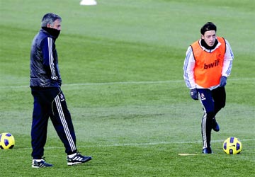 أوزيل خلال تدريبات الريال مع مورينيو أمس. إي.بي.إيه