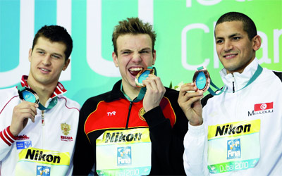 الملولي (يمين) شرف السباحة العربية في دبي. رويترز