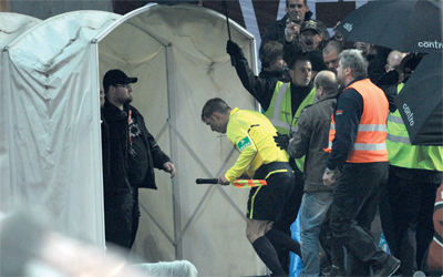 توقف اللعب في المباراة التي جمعت بين سان باولي وضيفه شالكه أول من أمس، في المرحلة الـ28 من الدوري الألماني لكرة القدم (بوندسليغا)، قبل ثوان من إطلاق صافرة النهاية، بسبب قذف زجاجة «جعة» بلاستيكية على مساعد الحكم. وكان شالكه متقدما 2/صفر على سان باولي عندما قذفت الزجاجة المملوءة بـ«الجعة» من المدرجات الخاصة بمشجعي الفريق المضيف، لترتطم بالجزء الخلفي من رأس حامل الراية. وبعد تشاور حكم الساحة دينيز آيتيكين، مع حامل الراية تورستن شيفنر، الذي سقط أرضاً، قرر آيتيكين إيقاف المباراة في الدقيقة .88