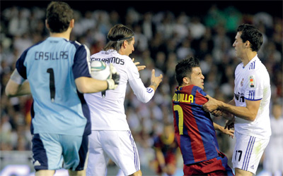 أربيلوا وراموس يحاولان إيقاف فيا بعنف بعد سقوطه. أ.ب