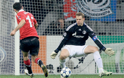 وتصدى نيوير لفرص محققة عدة من جانب فريق مانشستر الذي تسيد الشوط الأول من المباراة تماما.