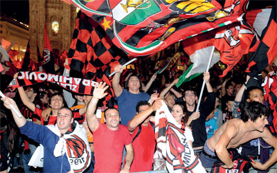 جمهور ميلان يعلن الأفراح في ساحة «بياتسا دل دوومو». أ.ب