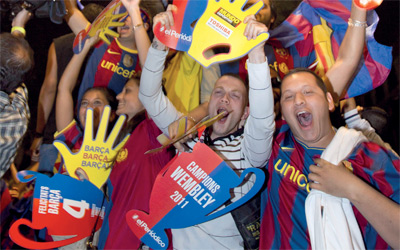 احتفل عشرات الآلاف من مشجعي برشلونة بفوز فريقهم بلقب بطل دوري ابطال اوروبا لكرة القدم أول من أمس. وتوج برشلونة باللقب الرابع في تاريخه عندما جدد فوزه على مانشستر يونايتد الانجليزي 3/1 على ملعب «ويمبلي» الشهير في لندن في المباراة النهائية. انطلقت الاحتفالات بعد صافرة الحكم النهائية معلنة فوز برشلونة، وهتف الآلاف «أبطال، أبطال» تحية لفريقهم الذي قدم اداءً رائعاً في النهائي. واستكملت الاحتفالات بعد وصول الفريق الى برشلونة، حيث تحيي المغنية الكولومبية شاكيرا حفلاً ضخماً في ملعب «كامب نو»، علماً بأنها في حالة إعجاب متبادل بمدافع الفريق الكاتالوني جيرار بيكيه، سلطت عليها الصحف الاضواء في الأشهر القليلة الماضية.