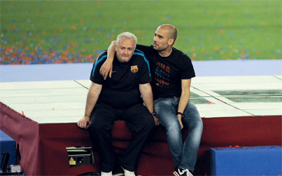 غوارديولا يجلس مع إداري من برشلونة . غيتي