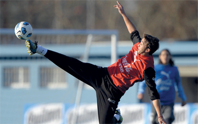 موسليرا يجرب مهاراته خلال تدريبات المنتخب الأوروغوياني. أ.ف.ب