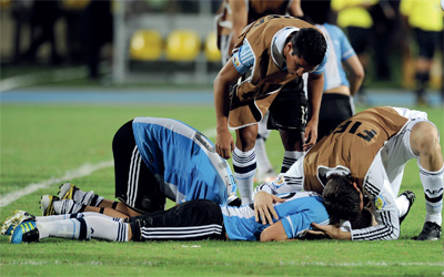 لاعبو الأرجنتين يواسون بعضهم بعد الخسارة. أ.ف.ب