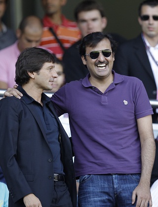 تميم بن حمد آل ثاني ومدرب باريس سان جيرمان البرازيلي ليوناردو يحضران مباراة في الجولة الأولى من الدوري الفرنسي. أ ب