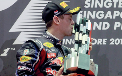 بات احتفاظ سائق ريد بول-رينو الألماني سيباستيان فيتيل بلقبه بطلاً للعالم في سباقات سيارات فورمولا 1 مسألة وقت، بعد ان أحرز المركز الاول في سباق جائزة سنغافورة الكبرى الجولة الرابعة من بطولة العالم الذي أقيم أمس تحت الاضواء الكاشفة على حلبة مارينا باي. وتقدم فيتيل، بطل العالم في العام الماضي، على البريطاني جنسون باتون (ماكلارين مرسيديس) وزميله في فريق ريد بول رينو الاسترالي مارك ويبر. وقطع فيتيل مسافة السباق ومقدارها 350.316 كلم في ساعة و59 دقيقة و6 أجزاء من الثانية بمعدل سرعة وسطي بلغ 155.810 كلم في الساعة.