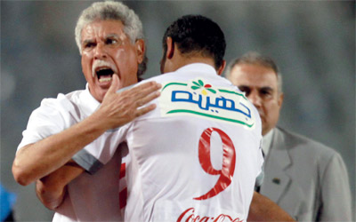 عمرو زكي يعانق مدربه حسن شحاتة بعد الفوز على حرس الحدود. رويترز