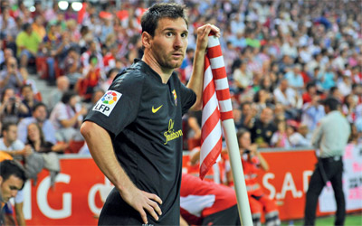 ميسي يستعد لتنفيذ ضربة ركنيـــــــــــــــــــــــــــــــــــــــة خلال مباراة خيخون. أ.ب