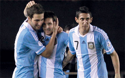 ميسي يتلقى التهاني من هيغواين ودي ماريا بعد تسجيله الهدف الرابع للأرجنتين. أ.ب
