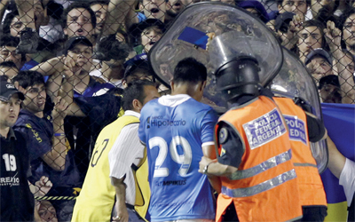 مشجع بوكا جونيورز يصرخ في وجه لاعب راسينغ كلوب. رويترز
