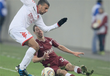 لاعب «هابويل» محمود عباس (يسار) في لقاء بوخاريست الروماني. الإمارات اليوم