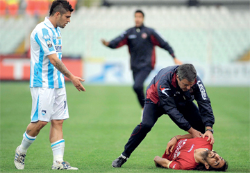 لاعب ليفورنو الإيطالي موروسيني مغشياً عليه على أرض الملعب. إي.بي.إيه