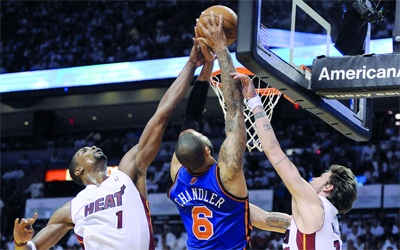 ويتأهل الى الدور الثاني من الـ«بلاي اوف» الفريق الذي يسبق منافسه الى الفوز بأربع مباريات من اصل سبع، وبالتالي بات كل من ميامي واوكلاهوما بحاجة الى فوزين لحجز بطاقتيهما الى الدور المقبل، فيما بات دالاس مافريكس بحاجة الى استعادة التوازن في المباراتين المقبلتين على ارضه غدا والسبت المقبل، لإدراك التعادل على الأقل والإبقاء على آماله في الدفاع عن لقبه، والأمر ذاته بالنسبة الى نيويورك نيكس الذي يستضيف ميامي هيت في المباراتين المقبلتين الخميس والأحد المقبل. في المباراة الأولى ضمن المنطقة الشرقية وعلى ملعب «اميركان ايرلاينز ارينا» في ميامي وامام 19 ألفاً و684 متفرجاً، تألق «الثلاثي الحلم» دواين وايد وكريس بوش و«الملك» ليبرون جيمس وقادوا فريقهم الى فرض سيطرته على مجريات المباراة وتحقيق الى فوز ثمين يعزز حظوظه في بلوغ الدور الثاني. وكان ميامي هيت حقق فوزاً كاسحاً في المباراة الأولى السبت الماضي، بنتيجة 100-67 ملحقاً بضيفه أقسى خسارة في الـ«بلاي اوف» منذ سقوطه امام شيكاغو بولز 85-126 في ابريل .1991 وجاءت المباراة قوية بين الفريقين ولم يتجاوز الفارق ثلاث نقاط في ارباعها الثلاثة الاولى، التي حسمها ميامي لمصلحته 27-24 و26-23 و25-22 على التوالي، قبل ان يكسب الربع الأخير بفارق نقطة واحدة 26-.25