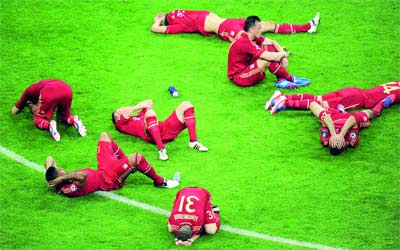 نجوم بايرن يفترشون الأرض حسرة وندماً على اللقب الضائع. أ.ف.ب
