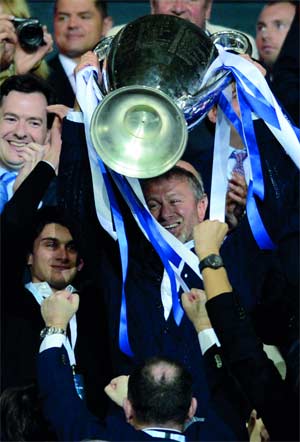 أبراموفيتش يحمل كأس الأبطال الأوروبية بعد عناء طويل. أ.ف.ب