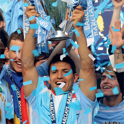 أغويرو منتشياً بلقب الدوري الإنجليزي الموسم المنصرم. أ.ف.ب