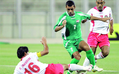 العراقي عماد محمد يحاول اجتياز فيصل إبـــــــــــــــــــــــــــــــــــــــــــــــــــــــــــــــــــــــــــــــــراهيم وخلفه عامر ذيب. أرشيفية