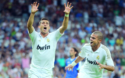رونالدو وبيبي يحتفلان بأحد أهداف ريال مدريد في الموسم المنصرم. غيتي