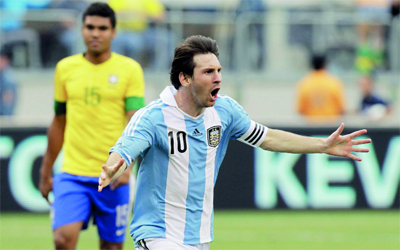 ميسي يحتفل بتسجيله هدف الفوز الرابع في مرمى البرازيل. رويترز