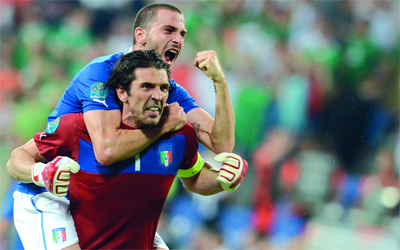 اجتاحت حالة من الفرح استاد مييسكي بمدينة بوزنان البولندية بمجرد أن أطلق الحكم صافرته معلناً تأهل المنتخب الإيطالي إلى دور الثمانية بيورو ،2012 عبر الفوز على ايرلندا بهدفين نظيفين، أول من أمس. وعاشت الجماهير الإيطالية حالة من الصخب بعدما عانت لحظات عصيبة قبل المباراة. وشهدت الفترة قبل انطلاق الجولة الأخيرة لمباريات المجموعة الثالثة قلقاً إيطالياً إزاء إمكانية حدوث اتفاق بين إسبانيا وكرواتيا، اللتين كانتا تمتلكان أربع نقاط، حول إنهاء المباراة بتعادل الفريقين 2/،2 وهي النتيجة التي تصعد بهما إلى دور الثمانية مع خروج الازوري نظراً لتطبيق لائحة فارق الأهداف في يورو ،2012 لكن الفريق الإسباني كذب هذه الأقاويل عبر الفوز على كرواتيا بهدف خيسوس نافاس. وبمجرد انتهاء المباراة أخذت الجماهير الإيطالية تهلل وتغني بعد التأهل العصيب إلى دور الثمانية، كما انهمرت دموع بعض المشجعين، وقفز آخرون من على مقاعدهم. والتف الحارس جيانلويجي بوفون حول أنطونيو كاسانو وماريو بالوتيلي صاحبي الهدفين الأول والثاني للازوري وأخذوا يتجولون في الملعب لتحية المشجعين.