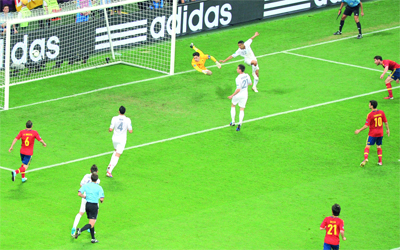 رأسية تشابي ألونسو في طريقهــــــــــــــــــــــــــــــــا لمعانقة شباك المنتخب الفرنسي. أ.ف.ب