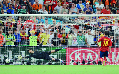 ما هو مؤكد أن المنتخب الاسباني ليس في قمة عطاءاته بالبطولة القارية الحالية، ويبدو أن ما كان يعتبر في 2008 قوة صاعدة على الساحة العالمية، أصبح اليوم منتخبا منهكا بعض الشيء، يعاني من الناحية التهديفية، على الرغم من هيمنته على أجواء المباريات. صحيح ان المنتخب الاسباني لم يتلق أي هدف في تسع مباريات على التوالي في الادوار الاقصائية، لكنه توج بلقب مونديال جنوب افريقيا بأربعة انتصارات متتالية، بهدف «يتيم» أمام البرتغال ثم الباراغواي وألمانيا، وأخيرا هولندا.