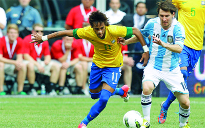 نيمار يحاول التخلص من الأرجنتيني ميسي خلال مباراة ودية. أ.ف.ب
